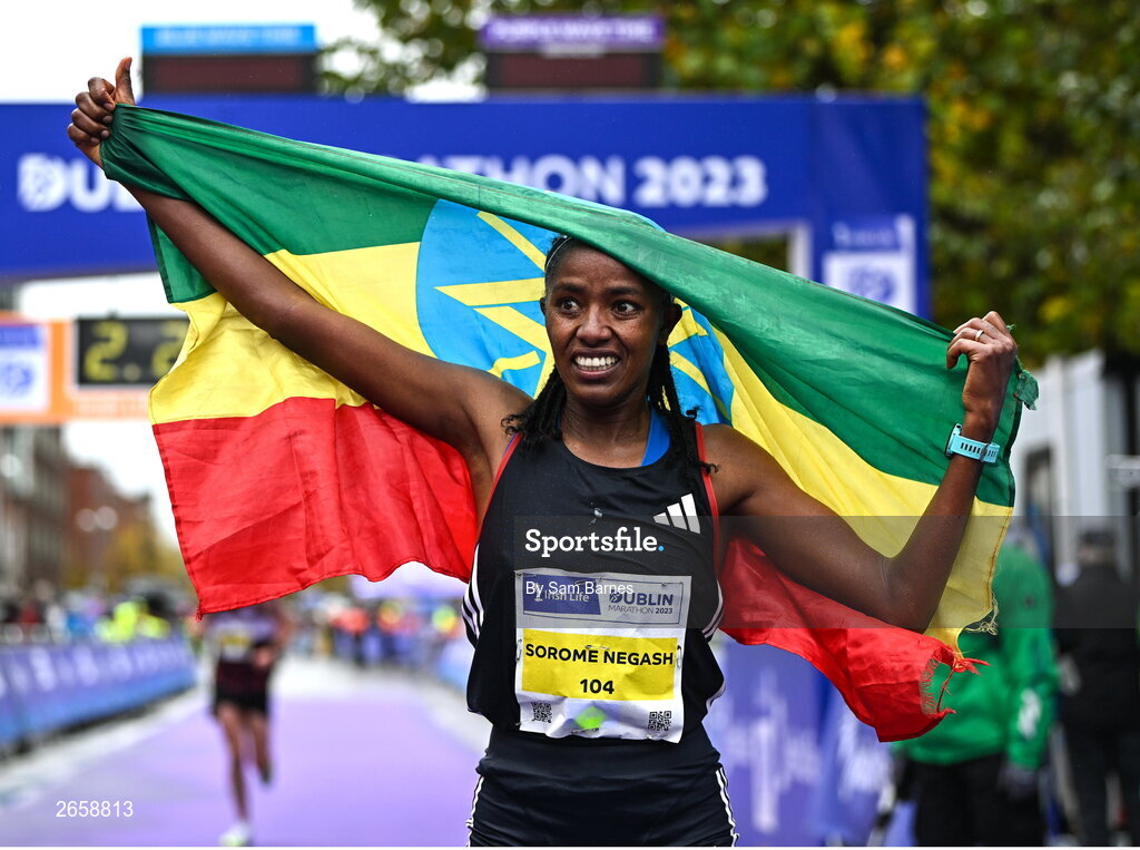 29 October 2023; Amente Sorome Negash celebrates after winning the women's event during the 2023 Irish Life Dublin Marathon. Thousands of runners took to the Fitzwilliam Square start line, to participate in the 42nd running of the Dublin Marathon. Photo by Sam Barnes/Sportsfile