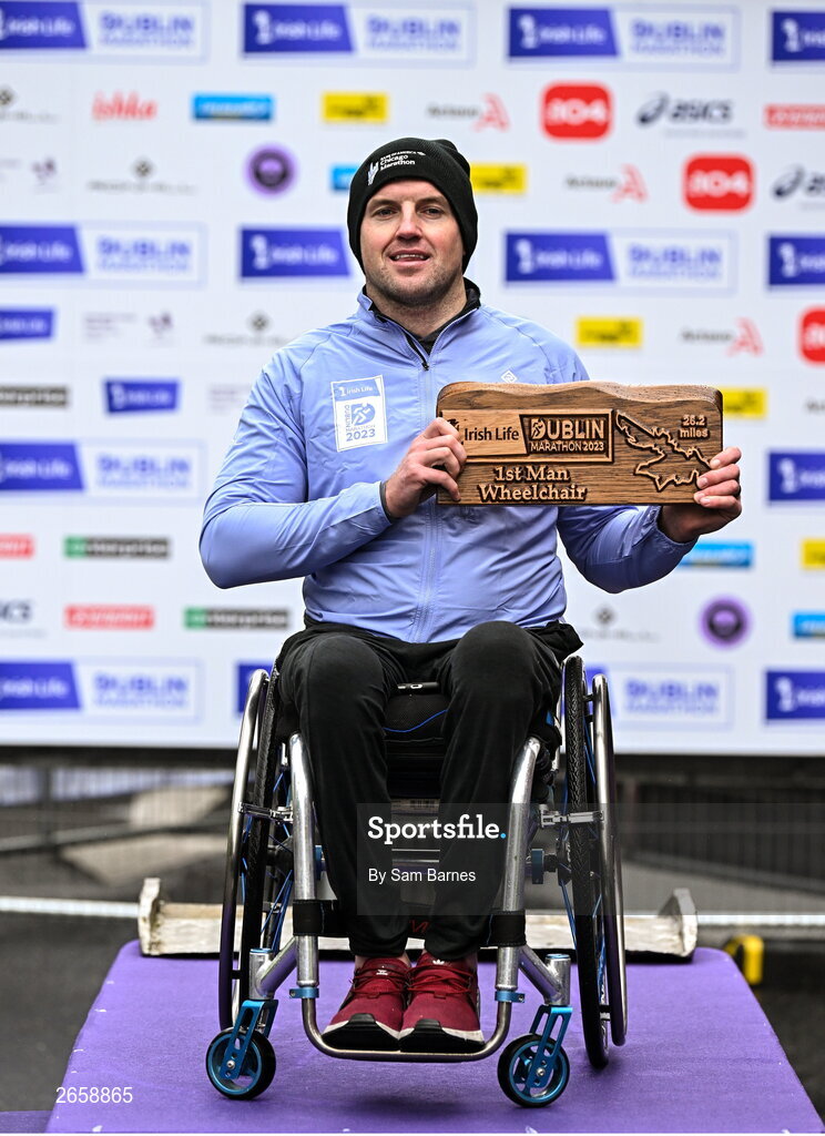 29 October 2023; Patrick Monahan from Kildare became the 2023 Irish Life Dublin Marathon champion of the men’s wheelchair race. Thousands of runners took to the Fitzwilliam Square start line, to participate in the 42nd running of the Dublin Marathon. Photo by Sam Barnes/Sportsfile