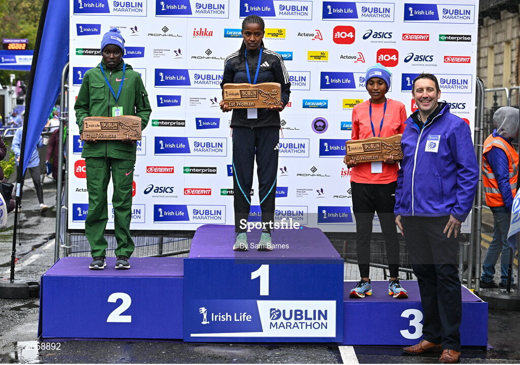 29 October 2023; The Women's event podium, from left, second place Joan Kipyatich, first place Amente Sorome Negash, and third place Genet Abdurkadir, with Irish Life CEO Declan Bolger after the 2023 Irish Life Dublin Marathon. Thousands of runners took to the Fitzwilliam Square start line, to participate in the 42nd running of the Dublin Marathon. Photo by Sam Barnes/Sportsfile