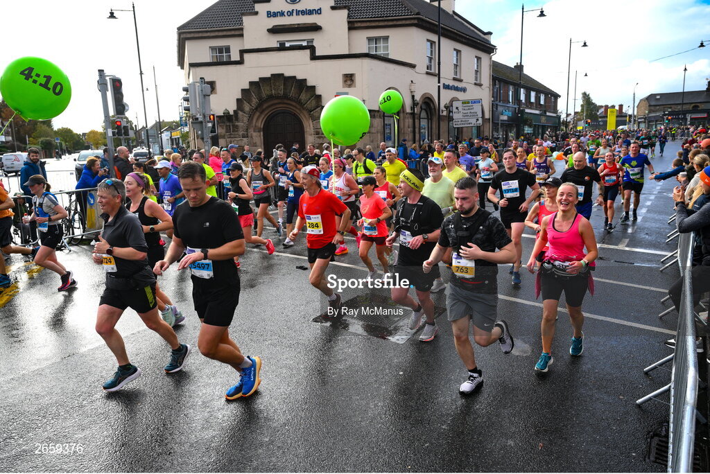 29 October 2023; Participants following a 4:10 pace pass through Terenure during the 2023 Irish Life Dublin Marathon. Thousands of runners took to the Fitzwilliam Square start line, to participate in the 42nd running of the Dublin Marathon. Photo by Ray McManus/Sportsfile