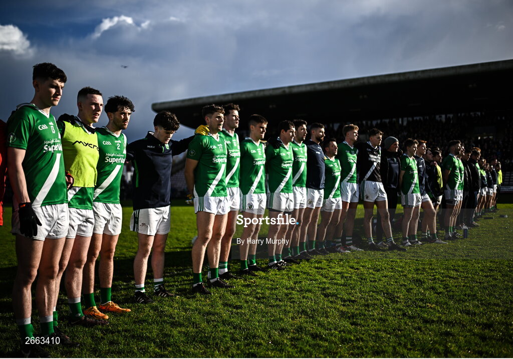 5 November 2023; Moycullen players stand for Amhrán na bhFiann before the Galway County Senior Club Football Championship final match between Corofin and Moycullen at Pearse Stadium in Galway. Photo by Harry Murphy/Sportsfile