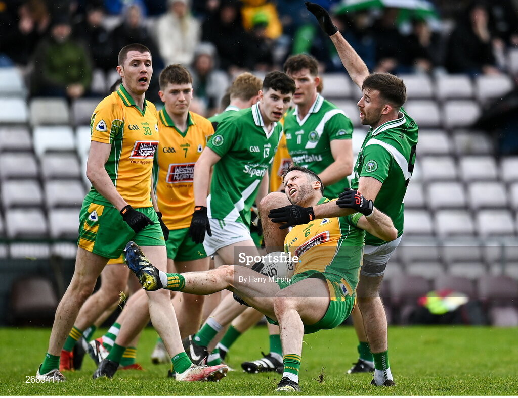 5 November 2023; Conor Cunningham of Corofin is tackled by Tomas Cleary of Moycullen during the Galway County Senior Club Football Championship final match between Corofin and Moycullen at Pearse Stadium in Galway. Photo by Harry Murphy/Sportsfile