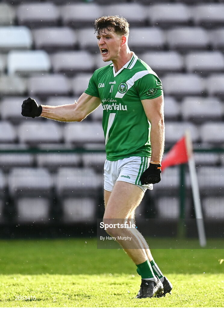5 November 2023; Owen Gallagher of Moycullen celebrates after kicking a point during the Galway County Senior Club Football Championship final match between Corofin and Moycullen at Pearse Stadium in Galway. Photo by Harry Murphy/Sportsfile