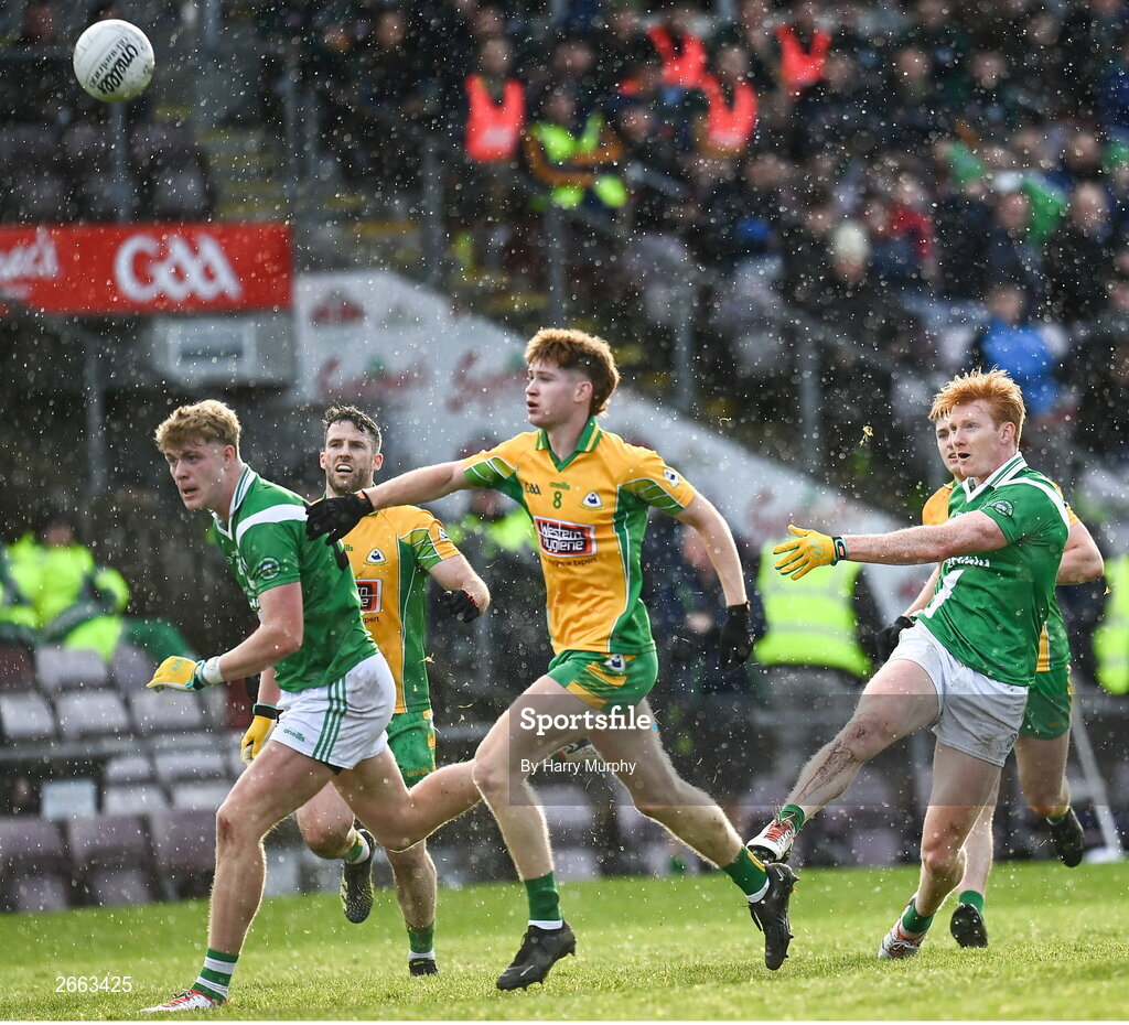 5 November 2023; Peter Cooke of Moycullen, right, kicks a point during the Galway County Senior Club Football Championship final match between Corofin and Moycullen at Pearse Stadium in Galway. Photo by Harry Murphy/Sportsfile