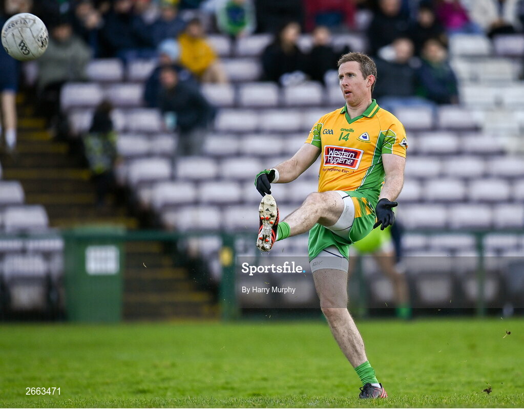 5 November 2023; Gary Sice of Corofin kicks a point during the Galway County Senior Club Football Championship final match between Corofin and Moycullen at Pearse Stadium in Galway. Photo by Harry Murphy/Sportsfile