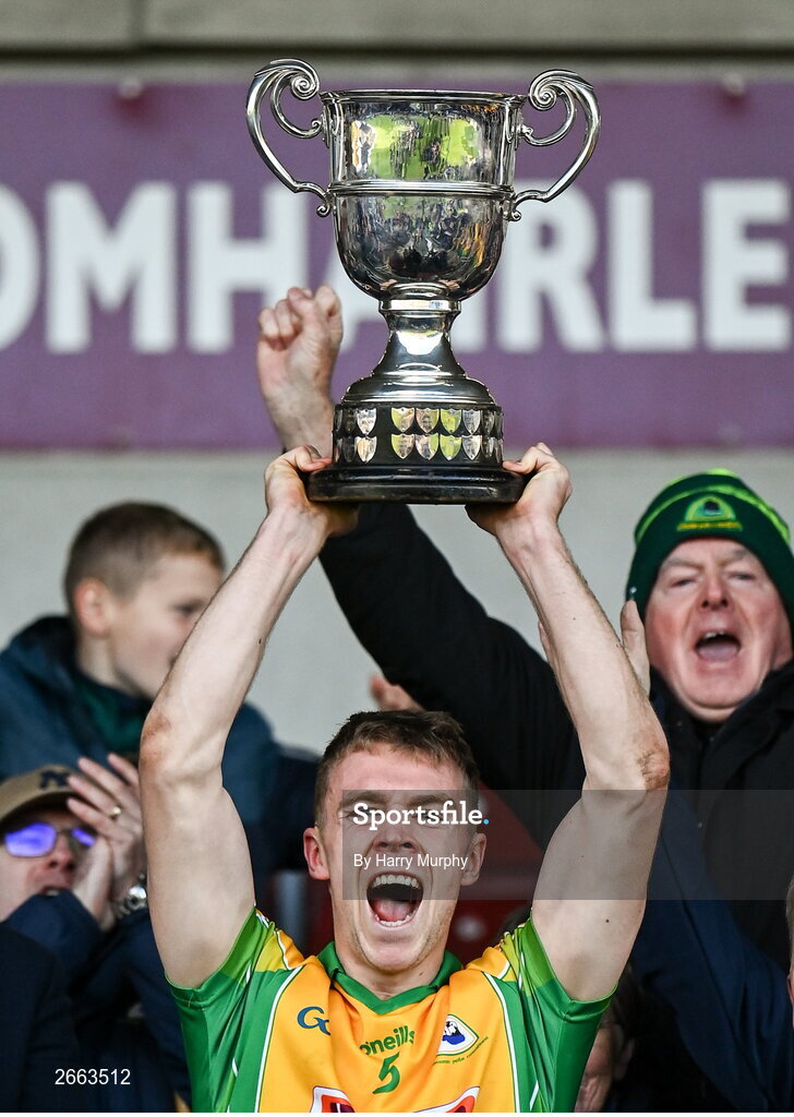 5 November 2023; Corofin captain Dylan McHugh lifts the cup after his side's victory in the Galway County Senior Club Football Championship final match between Corofin and Moycullen at Pearse Stadium in Galway. Photo by Harry Murphy/Sportsfile