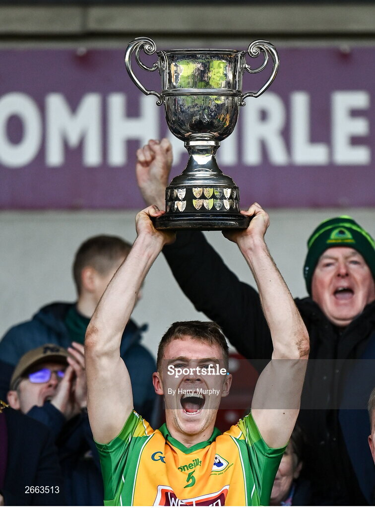 5 November 2023; Corofin captain Dylan McHugh lifts the cup after his side's victory in the Galway County Senior Club Football Championship final match between Corofin and Moycullen at Pearse Stadium in Galway. Photo by Harry Murphy/Sportsfile