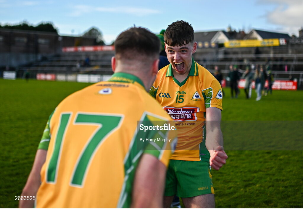 5 November 2023; Jack McCabe, right, and Ross Mahon of Corofin after their side's victory in the Galway County Senior Club Football Championship final match between Corofin and Moycullen at Pearse Stadium in Galway. Photo by Harry Murphy/Sportsfile