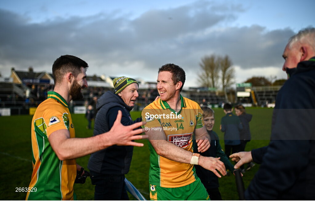 5 November 2023; Gary Sice, right and Martin Farragher of Corofin after their side's victory in the Galway County Senior Club Football Championship final match between Corofin and Moycullen at Pearse Stadium in Galway. Photo by Harry Murphy/Sportsfile