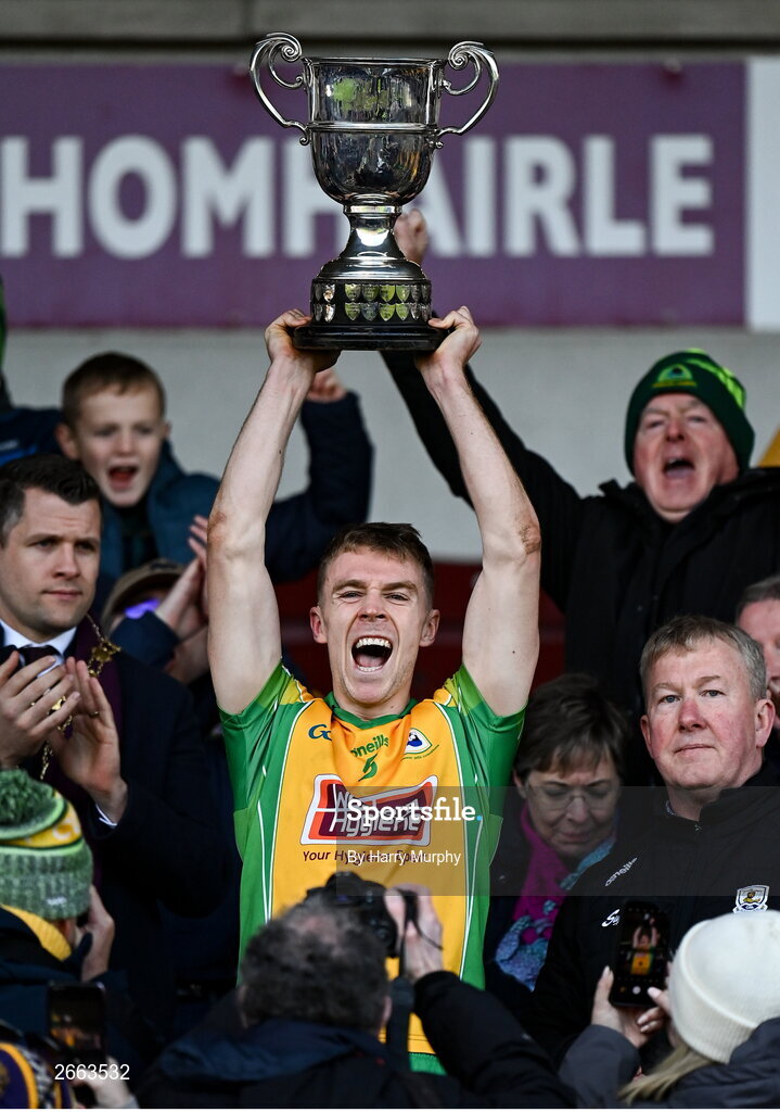 5 November 2023; Corofin captain Dylan McHugh lifts the cup after his side's victory in the Galway County Senior Club Football Championship final match between Corofin and Moycullen at Pearse Stadium in Galway. Photo by Harry Murphy/Sportsfile