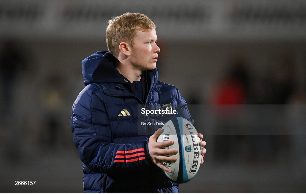 10 November 2023; Ethan Coughlan of Munster before the United Rugby Championship match between Ulster and Munster at Kingspan Stadium in Belfast. Photo by Seb Daly/Sportsfile