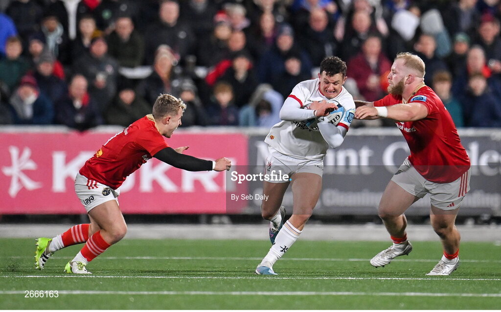 10 November 2023; Billy Burns of Ulster in action against Munster players Craig Casey, left, and Jeremy Loughman during the United Rugby Championship match between Ulster and Munster at Kingspan Stadium in Belfast. Photo by Seb Daly/Sportsfile