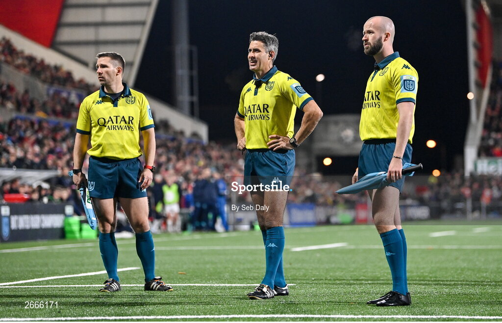 10 November 2023; Referee Frank Murphy, centre, with assistants Paul Haycock, left, and Robbie Jenkinson during the United Rugby Championship match between Ulster and Munster at Kingspan Stadium in Belfast. Photo by Seb Daly/Sportsfile