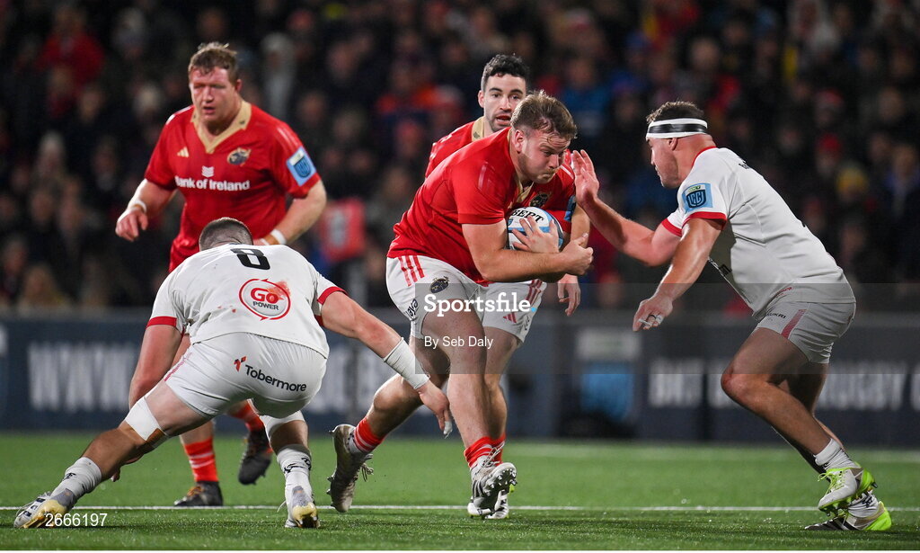 10 November 2023; Scott Buckley of Munster is tackled by Ulster players Nick Timoney, left, and Rob Herring during the United Rugby Championship match between Ulster and Munster at Kingspan Stadium in Belfast. Photo by Seb Daly/Sportsfile