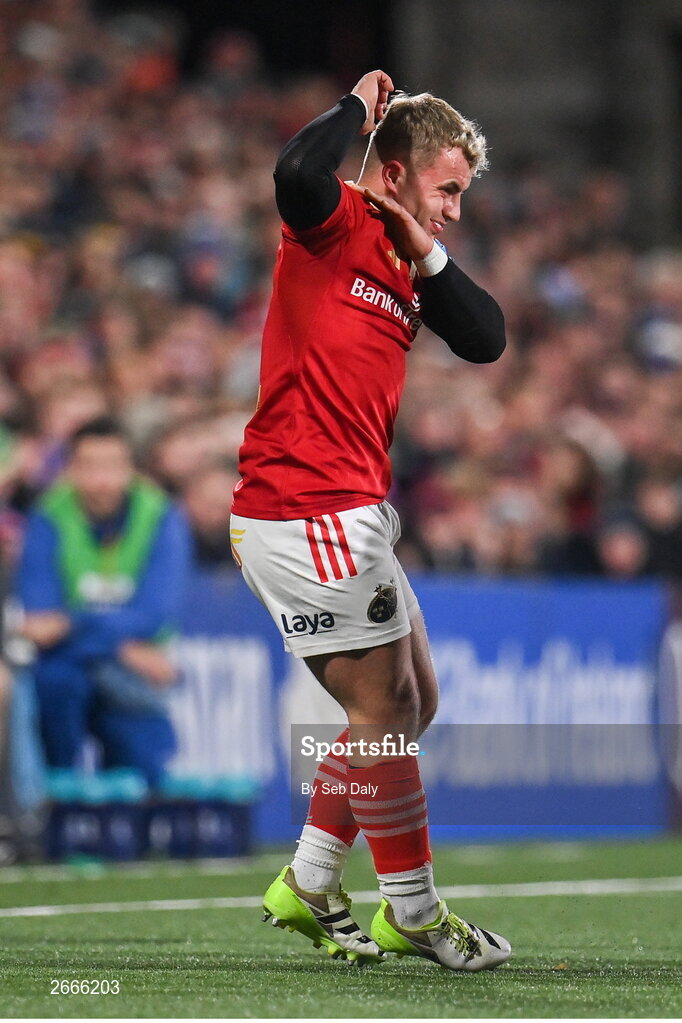 10 November 2023; Craig Casey of Munster reacts to an injury during the United Rugby Championship match between Ulster and Munster at Kingspan Stadium in Belfast. Photo by Seb Daly/Sportsfile