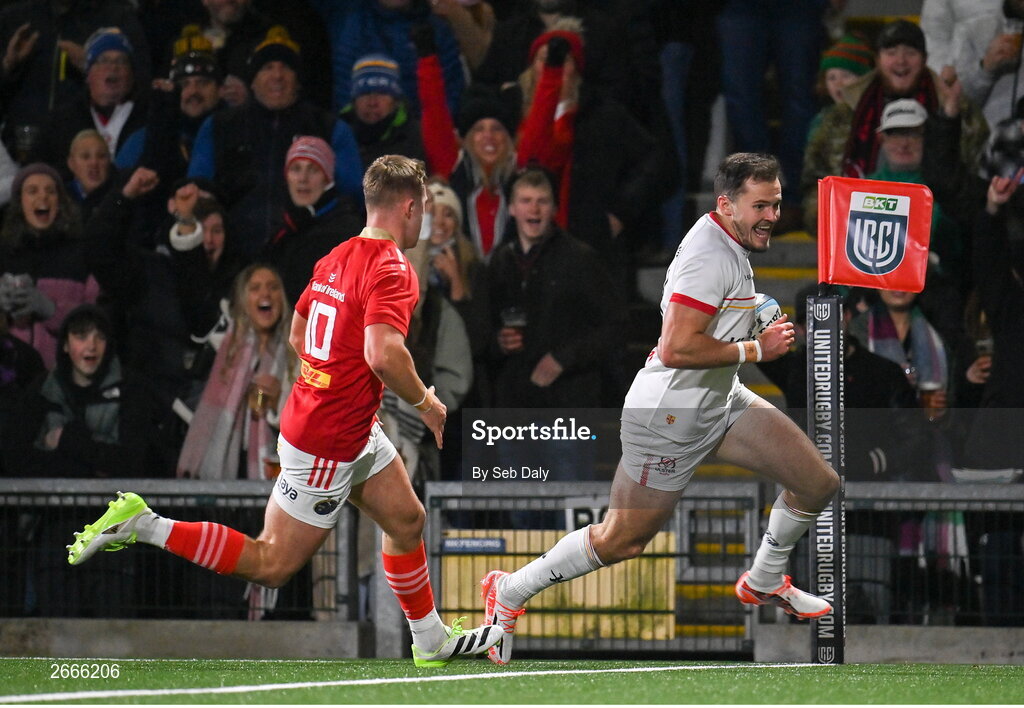 10 November 2023; Jacob Stockdale of Ulster on his way to scoring his side's first try during the United Rugby Championship match between Ulster and Munster at Kingspan Stadium in Belfast. Photo by Seb Daly/Sportsfile