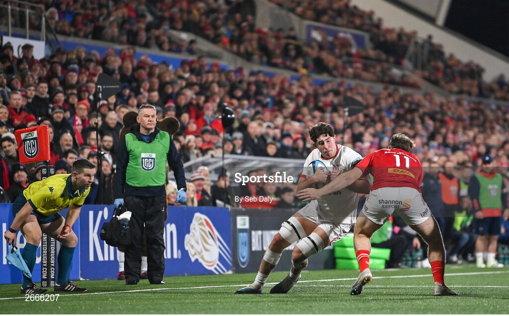 10 November 2023; David McCann of Ulster is tackled by Seán O’Brien of Munster, watched by Assistant referee Paul Haycock, during the United Rugby Championship match between Ulster and Munster at Kingspan Stadium in Belfast. Photo by Seb Daly/Sportsfile