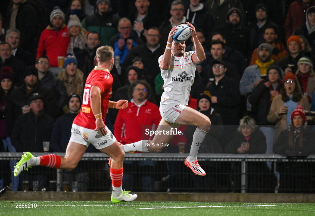 10 November 2023; Jacob Stockdale of Ulster gathers the ball on his way to scoring his side's first try during the United Rugby Championship match between Ulster and Munster at Kingspan Stadium in Belfast. Photo by Seb Daly/Sportsfile