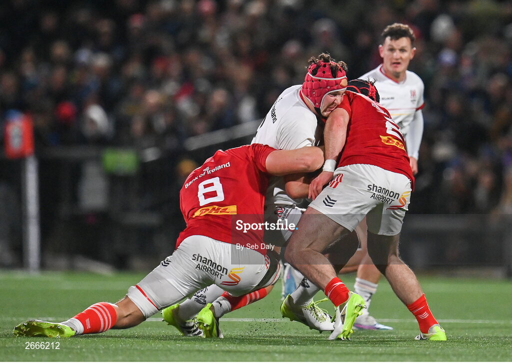 10 November 2023; Tom Stewart of Ulster is tackled by Munster players Gavin Coombes, left, and Diarmuid Barron during the United Rugby Championship match between Ulster and Munster at Kingspan Stadium in Belfast. Photo by Seb Daly/Sportsfile