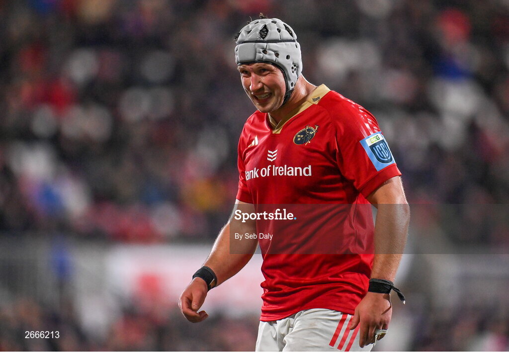 10 November 2023; Fineen Wycherley of Munster during the United Rugby Championship match between Ulster and Munster at Kingspan Stadium in Belfast. Photo by Seb Daly/Sportsfile