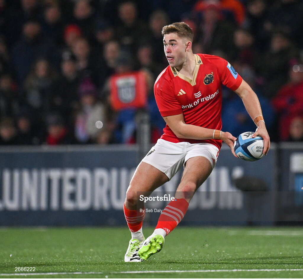 10 November 2023; Jack Crowley of Munster during the United Rugby Championship match between Ulster and Munster at Kingspan Stadium in Belfast. Photo by Seb Daly/Sportsfile
