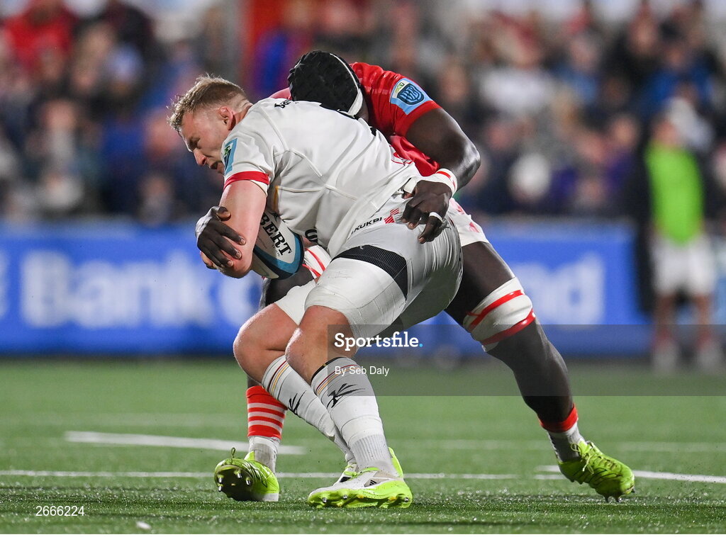 10 November 2023; Kieran Treadwell of Ulster is tackled by Edwin Edogbo of Munster during the United Rugby Championship match between Ulster and Munster at Kingspan Stadium in Belfast. Photo by Seb Daly/Sportsfile