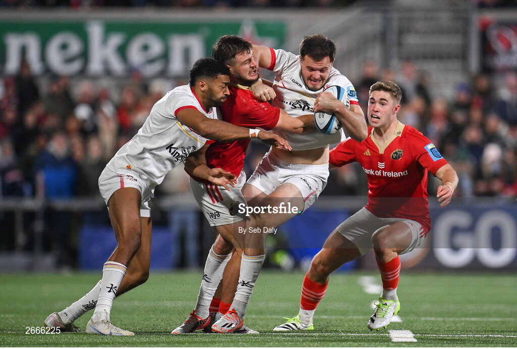 10 November 2023; Jacob Stockdale of Ulster is tackled by Alex Nankivell of Munster during the United Rugby Championship match between Ulster and Munster at Kingspan Stadium in Belfast. Photo by Seb Daly/Sportsfile