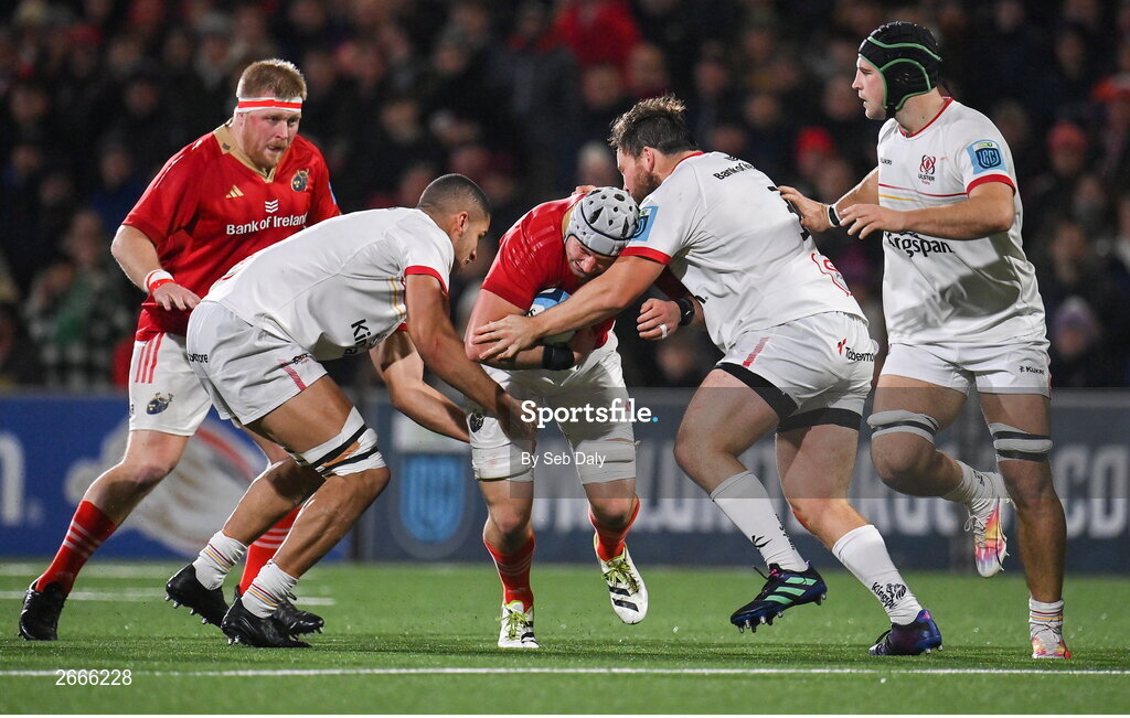 10 November 2023; Fineen Wycherley of Munster is tackled by Ulster players Cormac Izuchukwu, left, and Greg McGrath during the United Rugby Championship match between Ulster and Munster at Kingspan Stadium in Belfast. Photo by Seb Daly/Sportsfile