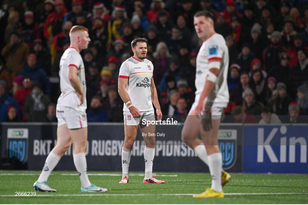 10 November 2023; Ulster players Jacob Stockdale, centre, with Nathan Doak, left, and Stuart McCloskey during the United Rugby Championship match between Ulster and Munster at Kingspan Stadium in Belfast. Photo by Seb Daly/Sportsfile