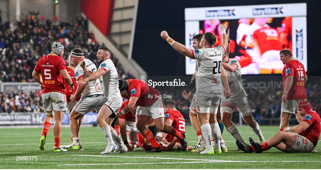 10 November 2023; Ulster players, including John Cooney, celebrate at the final whistle after their side's victory in the United Rugby Championship match between Ulster and Munster at Kingspan Stadium in Belfast. Photo by Seb Daly/Sportsfile