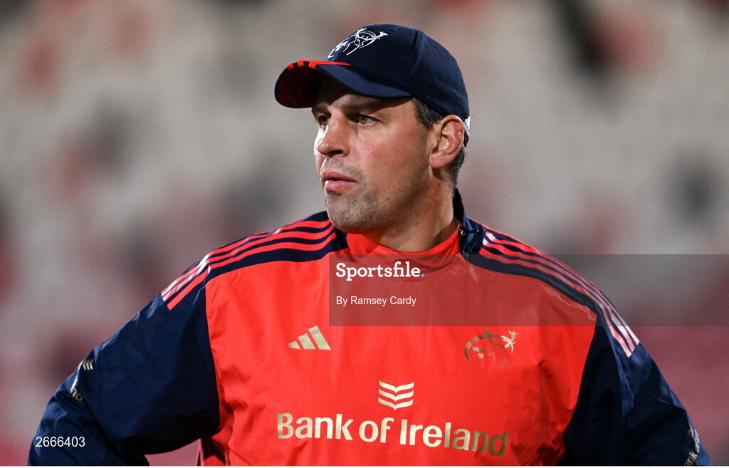 10 November 2023; Munster defence coach Denis Leamy before the United Rugby Championship match between Ulster and Munster at Kingspan Stadium in Belfast. Photo by Ramsey Cardy/Sportsfile
