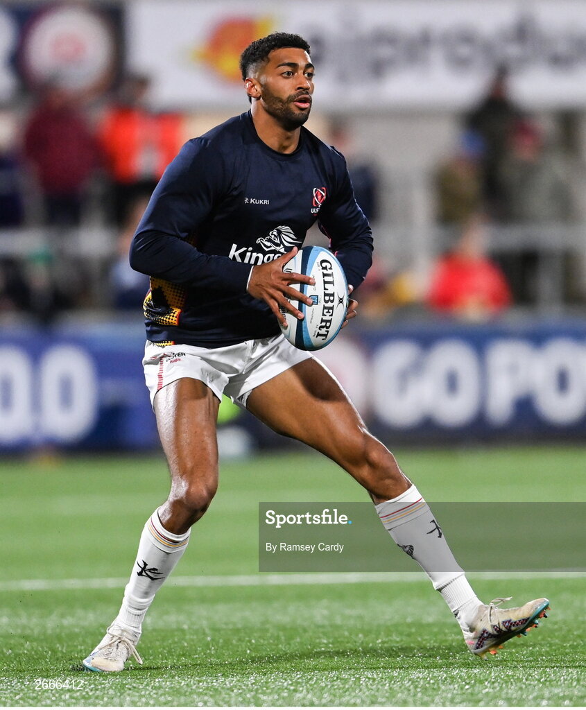 10 November 2023; Robert Baloucoune of Ulster before the United Rugby Championship match between Ulster and Munster at Kingspan Stadium in Belfast. Photo by Ramsey Cardy/Sportsfile