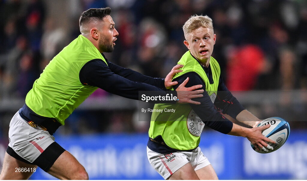 10 November 2023; Dave Shanahan, right, and John Cooney of Ulster before the United Rugby Championship match between Ulster and Munster at Kingspan Stadium in Belfast. Photo by Ramsey Cardy/Sportsfile
