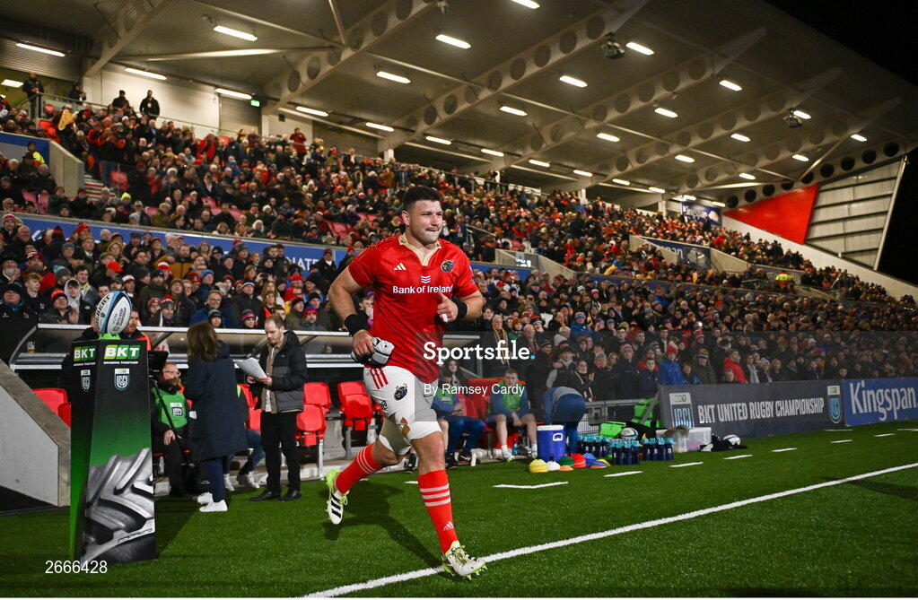 10 November 2023; Fineen Wycherley of Munster before the United Rugby Championship match between Ulster and Munster at Kingspan Stadium in Belfast. Photo by Ramsey Cardy/Sportsfile