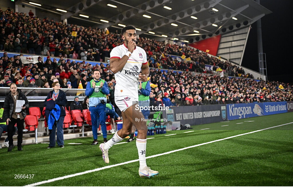 10 November 2023; Robert Baloucoune of Ulster before the United Rugby Championship match between Ulster and Munster at Kingspan Stadium in Belfast. Photo by Ramsey Cardy/Sportsfile