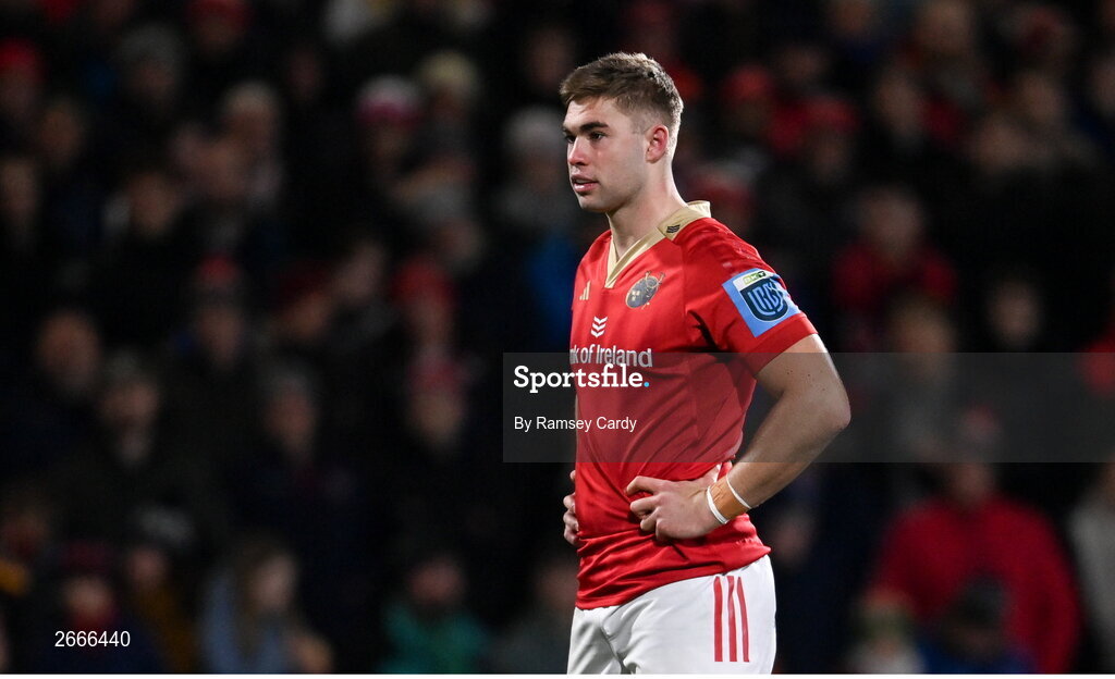 10 November 2023; Jack Crowley of Munster during the United Rugby Championship match between Ulster and Munster at Kingspan Stadium in Belfast. Photo by Ramsey Cardy/Sportsfile