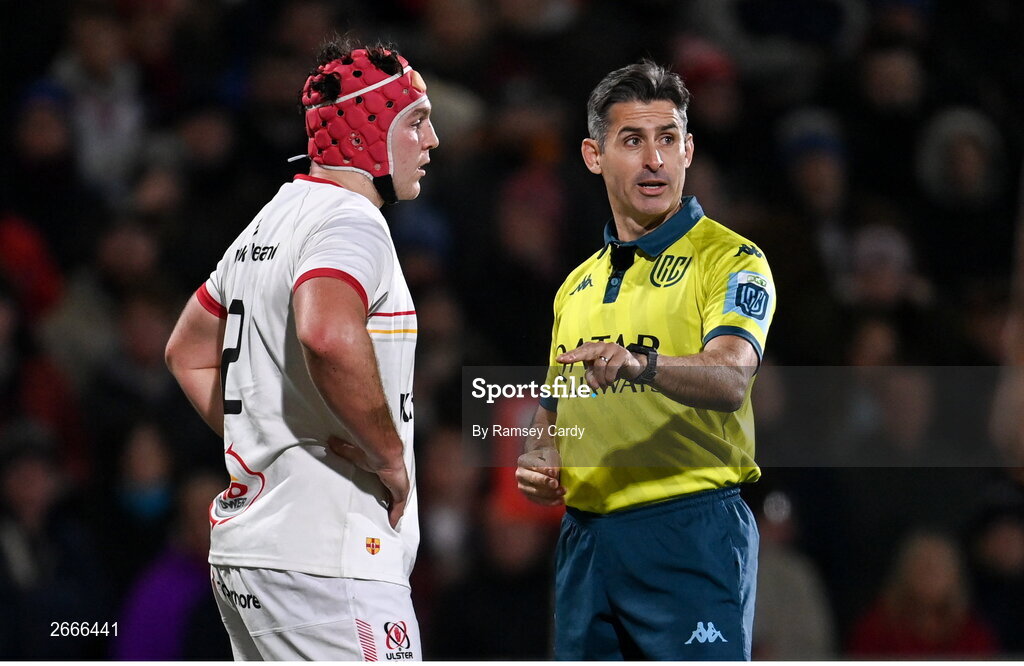 10 November 2023; Ulster captain Tom Stewart speaks to referee Frank Murphy during the United Rugby Championship match between Ulster and Munster at Kingspan Stadium in Belfast. Photo by Ramsey Cardy/Sportsfile