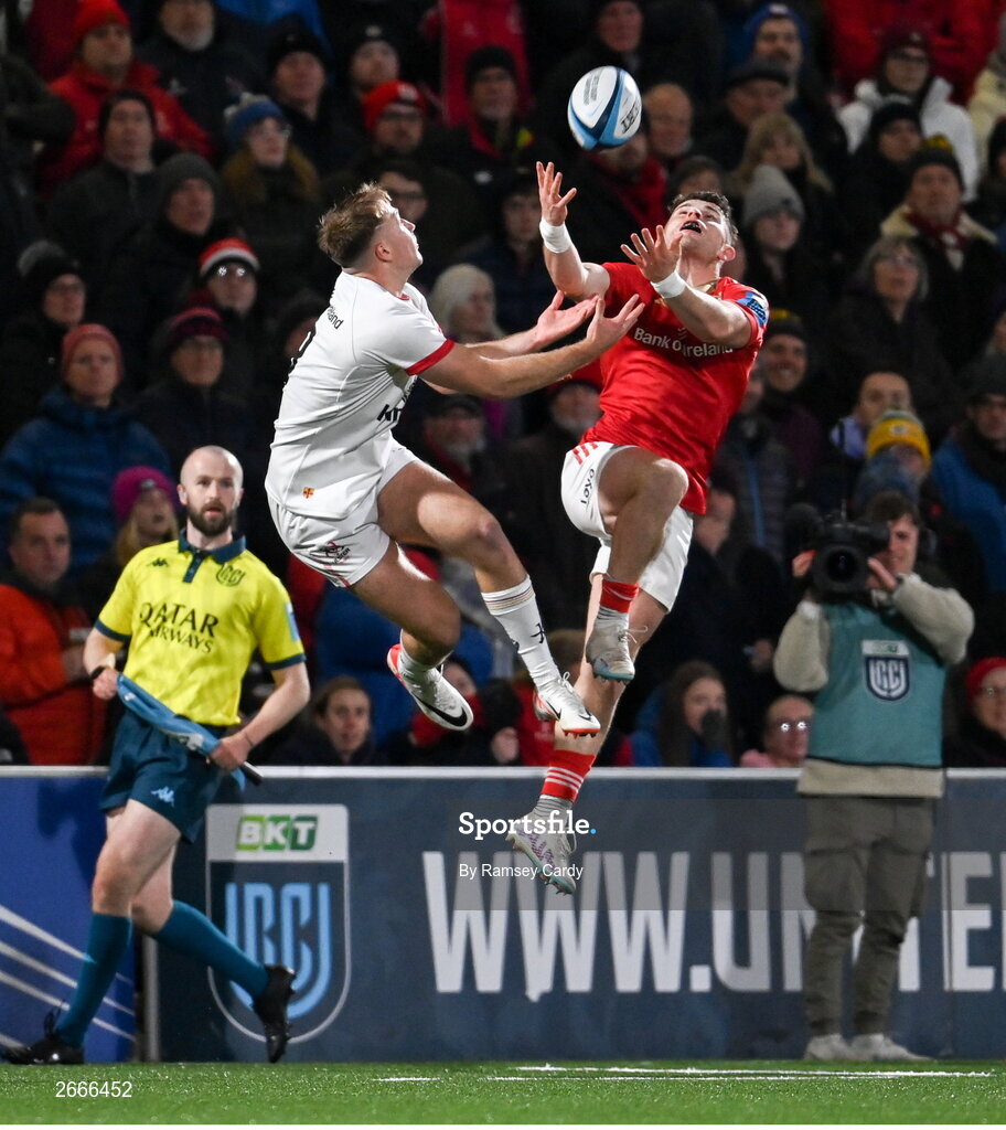 10 November 2023; Stewart Moore of Ulster and Calvin Nash of Munster during the United Rugby Championship match between Ulster and Munster at Kingspan Stadium in Belfast. Photo by Ramsey Cardy/Sportsfile