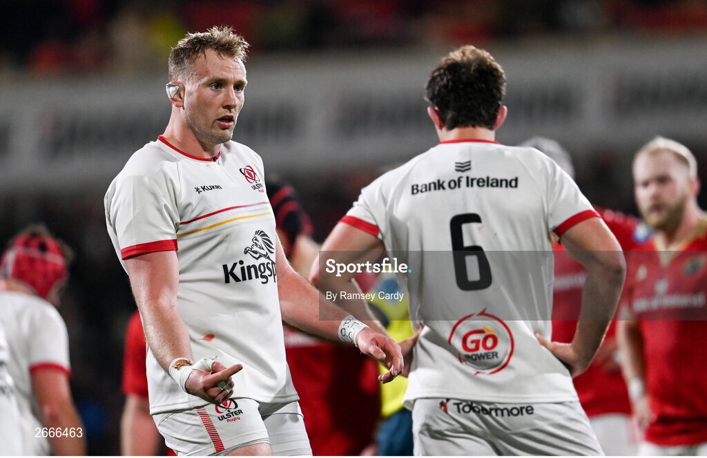 10 November 2023; Kieran Treadwell, left, and David McCann of Ulster during the United Rugby Championship match between Ulster and Munster at Kingspan Stadium in Belfast. Photo by Ramsey Cardy/Sportsfile