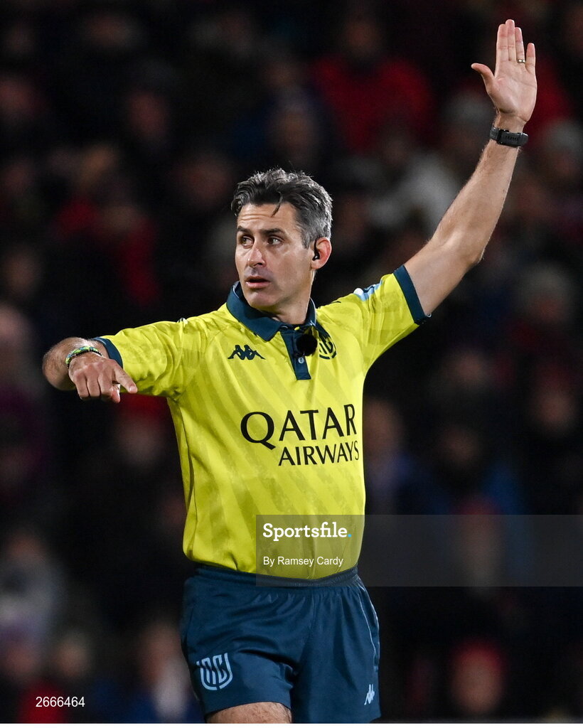 10 November 2023; Referee Frank Murphy during the United Rugby Championship match between Ulster and Munster at Kingspan Stadium in Belfast. Photo by Ramsey Cardy/Sportsfile