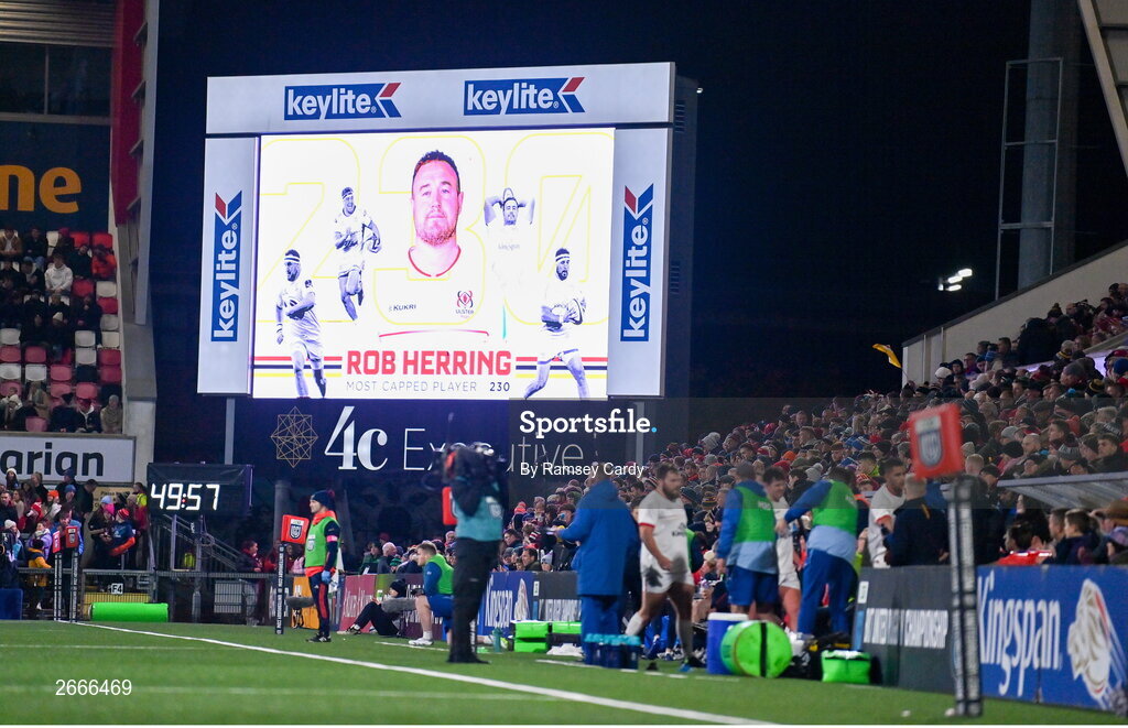 10 November 2023; Rob Herring of Ulster runs on for his 230th club appearance during the United Rugby Championship match between Ulster and Munster at Kingspan Stadium in Belfast. Photo by Ramsey Cardy/Sportsfile
