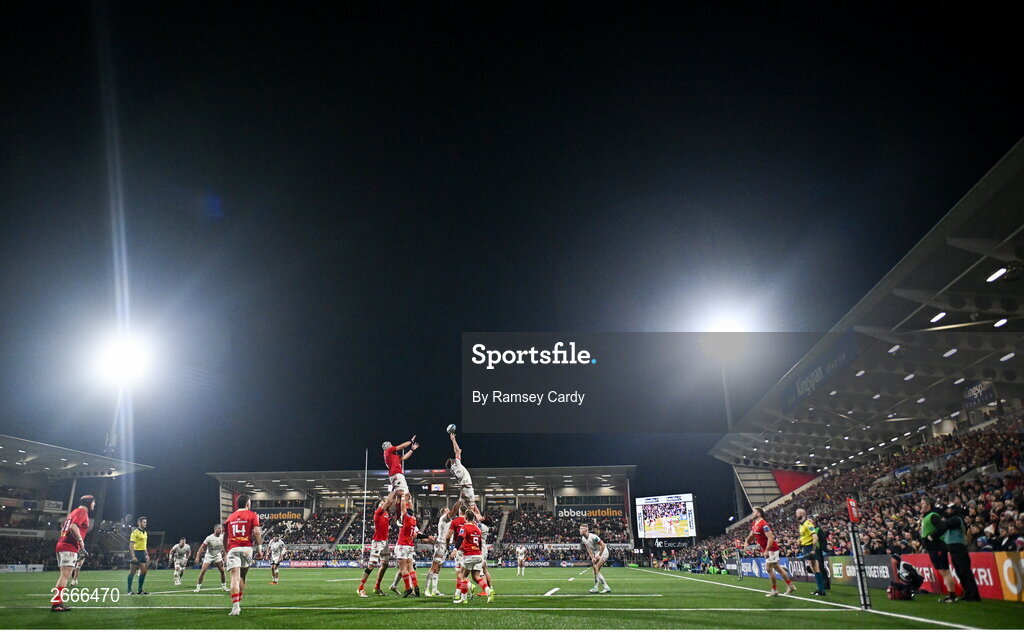 10 November 2023; David McCann of Ulster wins possesion in the lineout from Fineen Wycherley of Munster during the United Rugby Championship match between Ulster and Munster at Kingspan Stadium in Belfast. Photo by Ramsey Cardy/Sportsfile