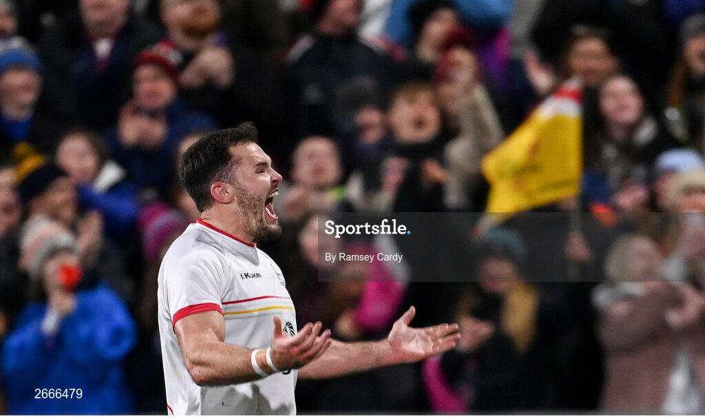 10 November 2023; Jacob Stockdale of Ulster celebrates at the final whistle of the United Rugby Championship match between Ulster and Munster at Kingspan Stadium in Belfast. Photo by Ramsey Cardy/Sportsfile