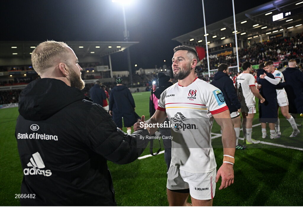 10 November 2023; John Cooney of Ulster and Jeremy Loughman of Munster after the United Rugby Championship match between Ulster and Munster at Kingspan Stadium in Belfast. Photo by Ramsey Cardy/Sportsfile