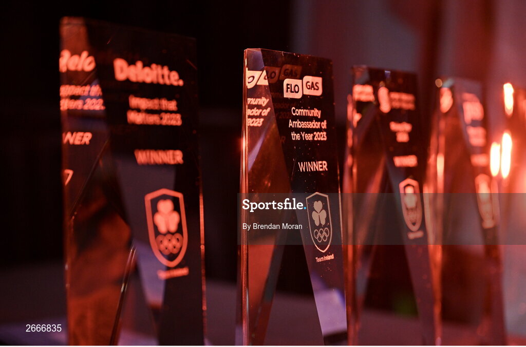 11 November 2023; A detailed view of the awards during the at the Team Ireland Olympic Ball at the Mansion House in Dublin. The event was a joint celebration of the brilliant performances of Team Ireland athletes at the European Games this summer, as well as the announcement of the winners of the Olympic Federation of Ireland Annual Awards. The event was attended by the Minister for Tourism, Culture, Arts, Gaeltacht, Sport and Media, Catherine Martin TD, Minister of State for Sport and Physical Education, Thomas Byrne TD, Olympic medallists, European Games athletes, Team Ireland Sponsors and Partners, Sport Ireland and the wider Olympic family. Photo by Brendan Moran/Sportsfile