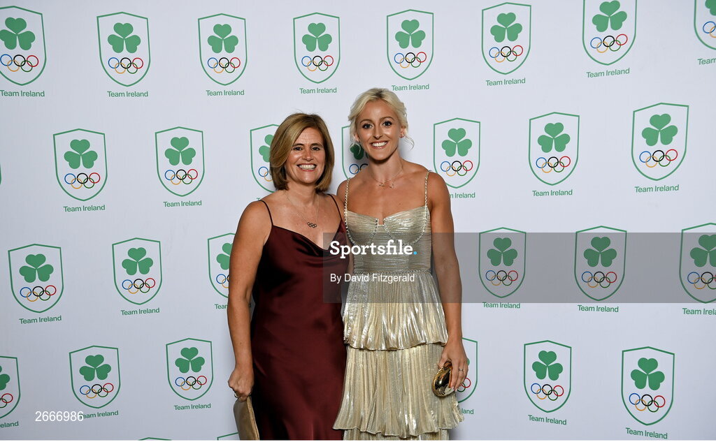 11 November 2023; Noelle Morrisey, left, and Olympian Sarah Lavin in attendance at the Team Ireland Olympic Ball at the Mansion House in Dublin. The event was a joint celebration of the brilliant performances of Team Ireland athletes at the European Games this summer, as well as the announcement of the winners of the Olympic Federation of Ireland Annual Awards. The event was attended by the Minister for Tourism, Culture, Arts, Gaeltacht, Sport and Media, Catherine Martin TD, Minister of State for Sport and Physical Education, Thomas Byrne TD, Olympic medallists, European Games athletes, Team Ireland Sponsors and Partners, Sport Ireland and the wider Olympic family. Photo by David Fitzgerald/Sportsfile