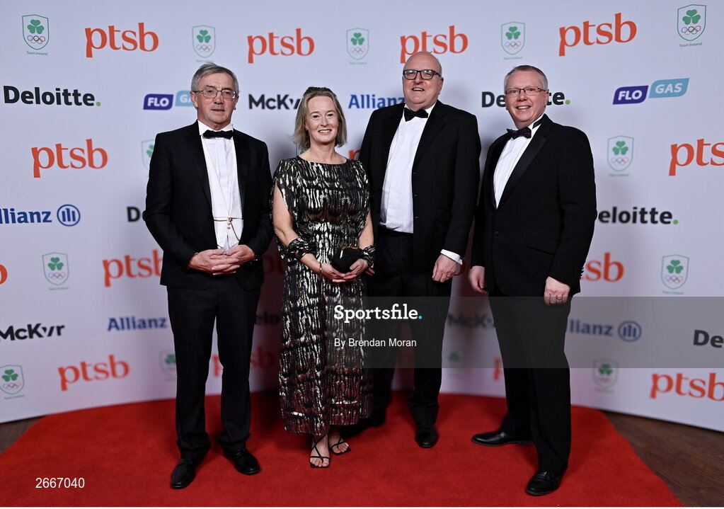 11 November 2023; Attendees, from left, Michael Blake, Eimear Mallon, Sport Ireland director of high performance Paul McDermott and Horse Sport Ireland chief executive Denis Duggan in attendance at the Team Ireland Olympic Ball at the Mansion House in Dublin. The event was a joint celebration of the brilliant performances of Team Ireland athletes at the European Games this summer, as well as the announcement of the winners of the Olympic Federation of Ireland Annual Awards. The event was attended by the Minister for Tourism, Culture, Arts, Gaeltacht, Sport and Media, Catherine Martin TD, Minister of State for Sport and Physical Education, Thomas Byrne TD, Olympic medallists, European Games athletes, Team Ireland Sponsors and Partners, Sport Ireland and the wider Olympic family. Photo by Brendan Moran/Sportsfile