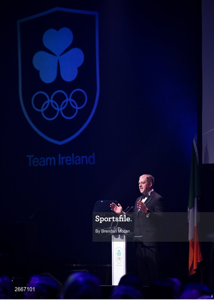 11 November 2023; Minister of State at the Department of Tourism, Culture, Arts, Gaeltacht, Sport and Media Thomas Byrne TD speaking during the Team Ireland Olympic Ball at the Mansion House in Dublin. The event was a joint celebration of the brilliant performances of Team Ireland athletes at the European Games this summer, as well as the announcement of the winners of the Olympic Federation of Ireland Annual Awards. The event was attended by the Minister for Tourism, Culture, Arts, Gaeltacht, Sport and Media, Catherine Martin TD, Minister of State for Sport and Physical Education, Thomas Byrne TD, Olympic medallists, European Games athletes, Team Ireland Sponsors and Partners, Sport Ireland and the wider Olympic family. Photo by Brendan Moran/Sportsfile