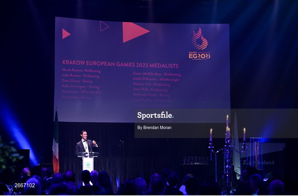 11 November 2023; MC Greg O'Shea speaking during the Team Ireland Olympic Ball at the Mansion House in Dublin. The event was a joint celebration of the brilliant performances of Team Ireland athletes at the European Games this summer, as well as the announcement of the winners of the Olympic Federation of Ireland Annual Awards. The event was attended by the Minister for Tourism, Culture, Arts, Gaeltacht, Sport and Media, Catherine Martin TD, Minister of State for Sport and Physical Education, Thomas Byrne TD, Olympic medallists, European Games athletes, Team Ireland Sponsors and Partners, Sport Ireland and the wider Olympic family. Photo by Brendan Moran/Sportsfile