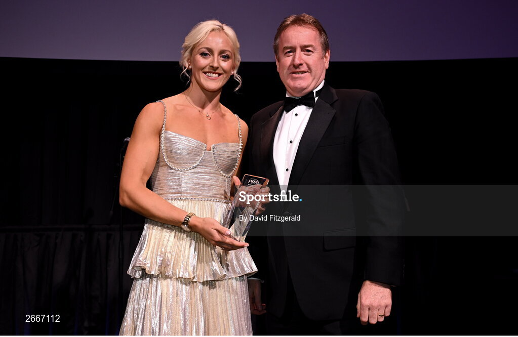11 November 2023; Olympian Sarah Lavin is presented the PTSB Inspiring the Nation Award by PTSB chief executive Eamonn Crowley at the Team Ireland Olympic Ball at the Mansion House in Dublin. The event was a joint celebration of the brilliant performances of Team Ireland athletes at the European Games this summer, as well as the announcement of the winners of the Olympic Federation of Ireland Annual Awards. The event was attended by the Minister for Tourism, Culture, Arts, Gaeltacht, Sport and Media, Catherine Martin TD, Minister of State for Sport and Physical Education, Thomas Byrne TD, Olympic medallists, European Games athletes, Team Ireland Sponsors and Partners, Sport Ireland and the wider Olympic family. Photo by David Fitzgerald/Sportsfile